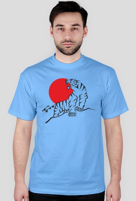 Ryczący tygrys na tle czerwonego, japońskiego słońca. Wzór wykonano przy użyciu dówch kolorów: czarnego i czerwonego, reszta stanowi oryginalny materiał koszulki.