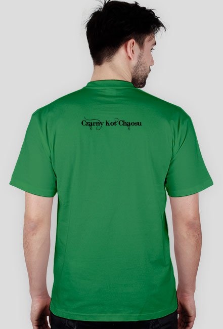 Logo Czarny Kot Chaosu. Logo czarne sklepu na plecach. Koszulka męska.