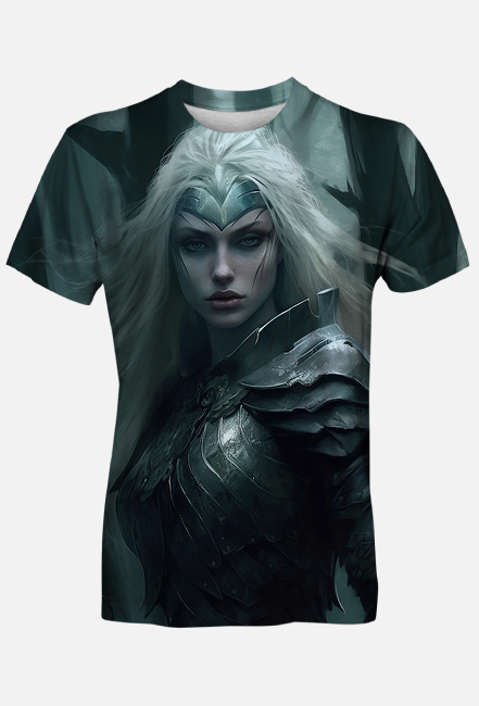 Stylkowa koszulka z wizerunkiem elfiej wojowniczki imieniem Elanor. Tył przedstawia mroczny las, w którym kryje się smok w oddali. Ilustracje w stylu Dark Fantasy. Wizerunek przedstawia elfią wojowniczkę w zbroi płytowej i diademem na głowie.