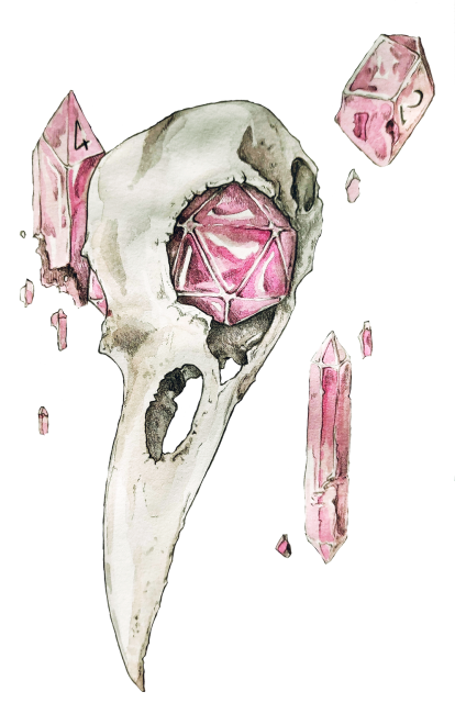 "Bird Skull RPG" to ptasia czaszka z kryształową kością do gry (k20) w oczodole i mniejszymi minerałami lewitującymi wokół niej. Widnieją na nich cyfry tak jakby powstały w sposób zupełnie naturalny, odnosząc się w ten sposób do nazwy całej kolekcji i przesłania jakie ze sobą niesie - odgrywania postaci zgodnie z naszym ja i czerpaniu satysfakcji ze spędzanego w ten sposób wolnego czasu.