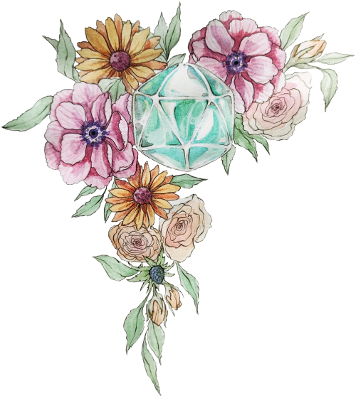 "Flowers and Dice RPG" to kryształowa kostka do gry (k20) w otoczeniu pięknych kolorowych kwiatów i liści. Te elementy przyrody odnoszą się do nazwy całej kolekcji i przesłania jakie ze sobą niesie - odgrywania postaci zgodnie z naszym naturalnym ja i czerpaniu satysfakcji ze spędzanego w ten sposób wolnego czasu.