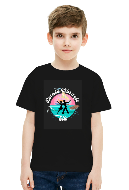 Letnie wibracje prosto znad jeziora! Ta koszulka to idealna propozycja dla małych miłośników słońca, tańca i przygód. Nadruk w żywych kolorach na czarnym tle robi wrażenie - żaglówka, taniec, łódka, mewy i podwodny świat - to wszystko w jednym, unikalnym projekcie!