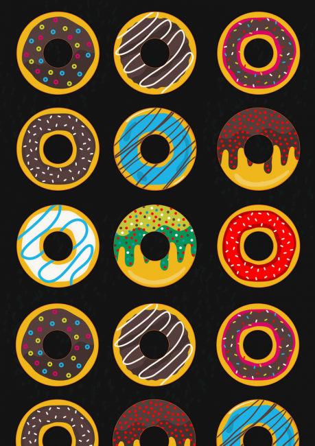 Bawełniana maseczka z nadrukiem - Donutowo. Nadruk zawiera smakowite pączki - donuty z czekoladową polewą, lukrem oraz posypką. Smakowite słodycze! W takiej maseczce z pewnością będzie miło wyjść z domu.