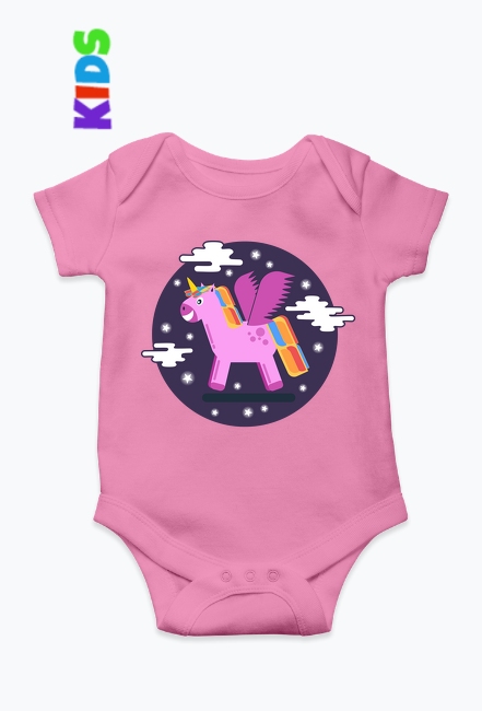Dziecięce body dla chłopca i dziewczynki z kolorowym, skrzydlatym jednorożcem. Sympatyczny unicorn, jednorożec latający pośród chmur i gwiazd. Ubranko, body dla niemowlaka.