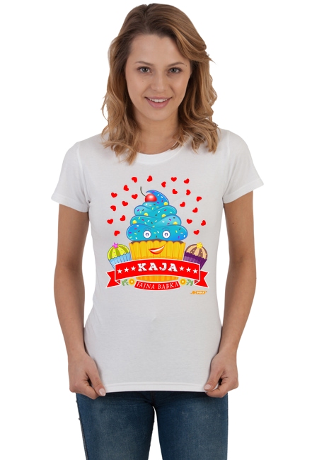 Damska koszulka z krótkim rękawem i nadrukiem - Kaja Fajna Babka. Tshirt z imieniem Kaja i sympatyczną babeczką. Idealny pomysł na imieniny lub urodziny dla kobiety o imieniu Kaja, Kajunia, Kajanna, Kajcia, Kajusia, Kajaś, Kajuchna, Kajra, Kajtusia.