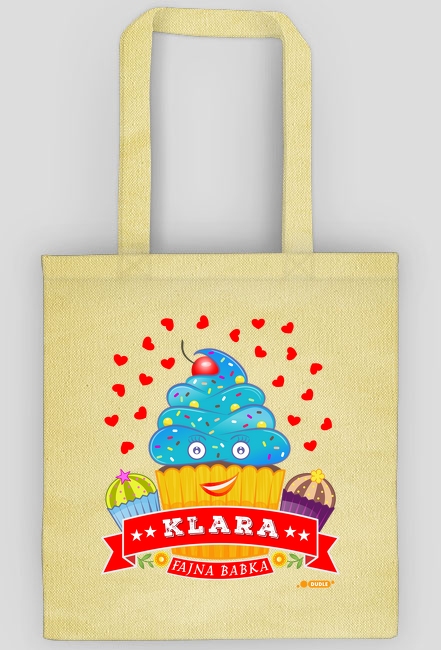Torba na zakupy z nadrukiem - Klara Fajna Babka. Torba zakupowa z imieniem Klara i sympatyczną babeczką. Idealny pomysł na imieniny lub urodziny dla kobiety o imieniu Klarysa, Klara, Klarunia, Klareńka, Klaruśka, Klarusia, Klaruś, Klareczka, Klarcia.