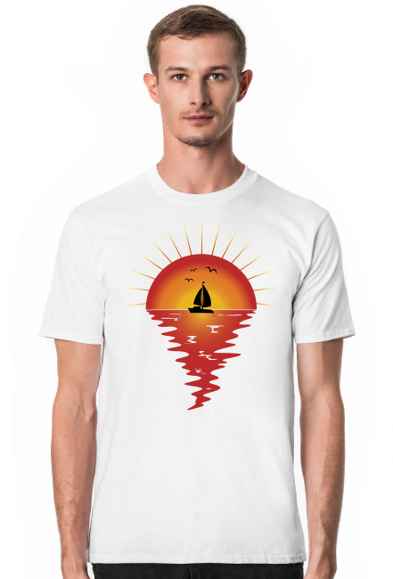 Męska koszulka dostępna w kilku kolorach z nadrukiem "Zachód słońca nad oceanem". Motyw na t-shircie przedstawia zachodzące słońce, morze lub ocean, żaglówkę i latające ptaki.