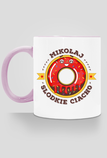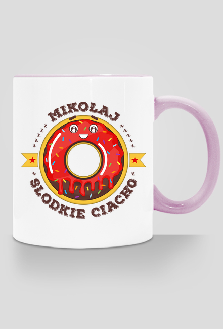Biało-kolorowy kubek z nadrukiem - Mikołaj Słodkie Ciacho. Dobry pomysł na prezent z okazji imienin lub urodzin dla mężczyzny o imieniu Mikołaj, Mikołajek, Mikołajuś, Mikoś, Mik. Nadruk zawiera napis oraz uśmiechnięte ciastko - pączek donut z czekoladową i czerwoną polewą oraz posypką. W końcu każdy facet to ciacho!