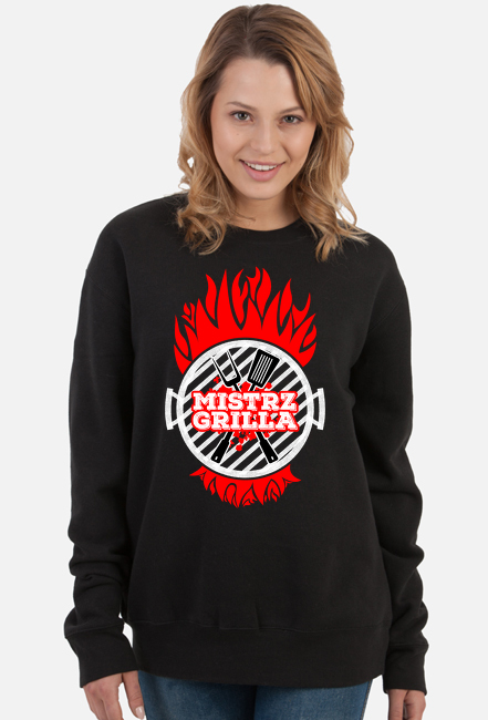 Czarna, klasyczna bluza damska bez kaptura z nadrukiem "Mistrz Grilla". Jeśli grillowanie to Twoje hobby to ta bluza jest dla Ciebie. Możesz ją też dać komuś na prezent - dla mamy, dla siostry, dla babci, ciotki. Idealna bluza na chłodniejsze dni, na czas grillowania. Grill to dzisiaj moda i trendy.