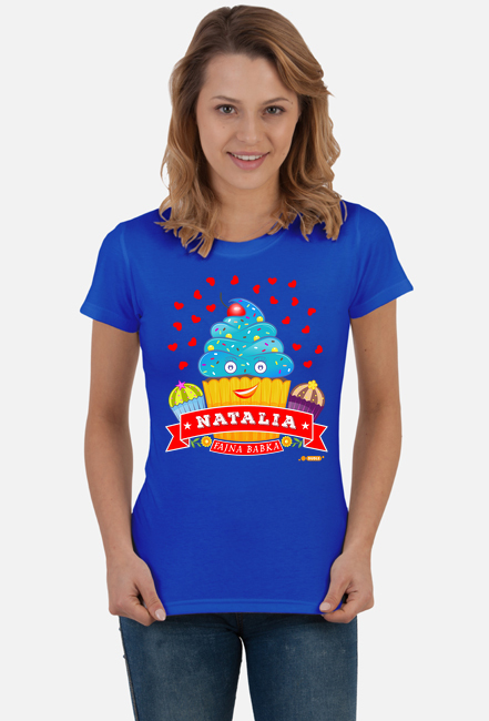 Damska koszulka z krótkim rękawem i nadrukiem - Natalia Fajna Babka. Tshirt z imieniem Natalia i sympatyczną babeczką. Idealny pomysł na imieniny dla kobiety o imieniu Natalka, Natalik, Nastii, Nasti, Natusia, Nataleńka, Nastusia.
