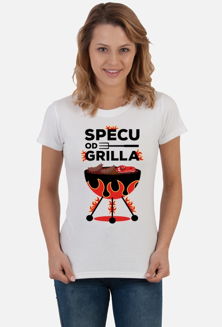 Damska koszulka, w białym i kilku jasnych kolorach do wyboru, z nadrukiem "Specu od Grilla". Lubisz grillować, to Twoje hobby? W takim razie ta koszulka jest dla Ciebie. Możesz ją też dać komuś na prezent. Idealna koszulka na lato i wakacje, na czas grillowania. Grill to dzisiaj moda i trendy. Kobiety i dziewczyny mogą dumnie nosić ten t-shirt nie tylko podczas grillowania kiełbasek.
