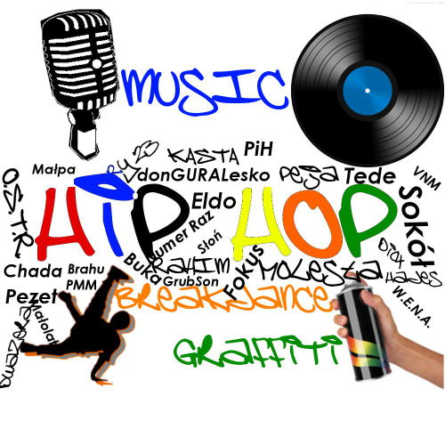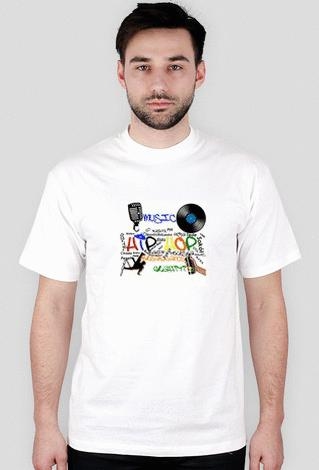Biała koszulka z kolorowym nadrukiem. Na środku widnieje duży napis Hip Hop. Znajdują się obrazki i napisy dot. całej kultury hip-hopowej. Na dodatek wokół tych napisów widnieją napisane niewielką czcionką ksywki wybranych polskich raperów.