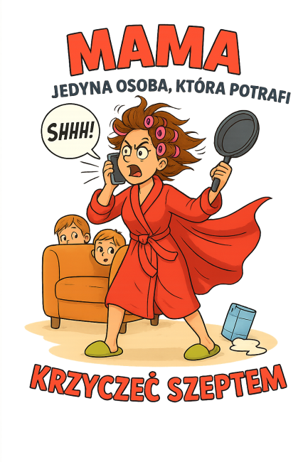 Zabawna i trafna grafika idealna na Dzień Mamy! Przedstawia mamę-menadżerkę życia rodzinnego – z plannerem, kawą, słuchawką Bluetooth i karteczkami przypominającymi o misjach dnia codziennego. W tle dzieci-ninja, pies z papierem toaletowym i kuchenny rozgardiasz – czyli klasyka każdego rodzinnego poranka.
