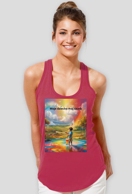Koszulka z nadrukiem dziecka w tęczy z napisem "Moje dziecko mój skarb."