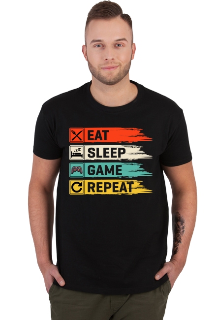Kochasz gry? Ta koszulka gamingowa została zaprejktowana z myślą o Tobie! Eat, sleep game, repeat - czyż nie tak wygląda wymarzony dzień każdego gracza? ;)
