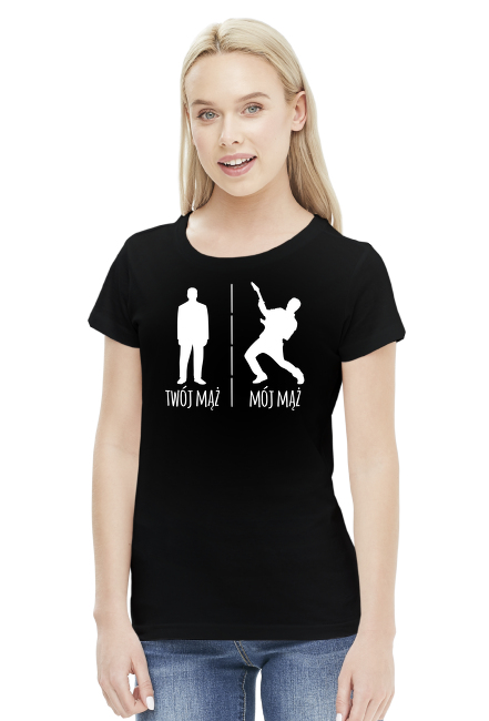 Mój mąż - koszulka żony gitarzysty. Damski t-shirt z nadrukiem. Luźna koszulka, taliowana. Pochwal się tym, że Twój mąż jest gitarzystą! Pokaż mężowi, że jesteś dumna z tego, że gra na gitarze. Możesz zamówić także koszulkę komuś w prezencie. Polecam! Gitarmaniak
