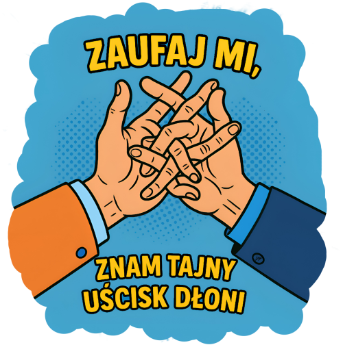 Trochę pop-art, trochę konspiracja, a trochę czysty żart. Bo jeśli ktoś zna taki uścisk dłoni, to wiesz, że możesz mu zaufać… albo przynajmniej dać się zaprosić na kawę.