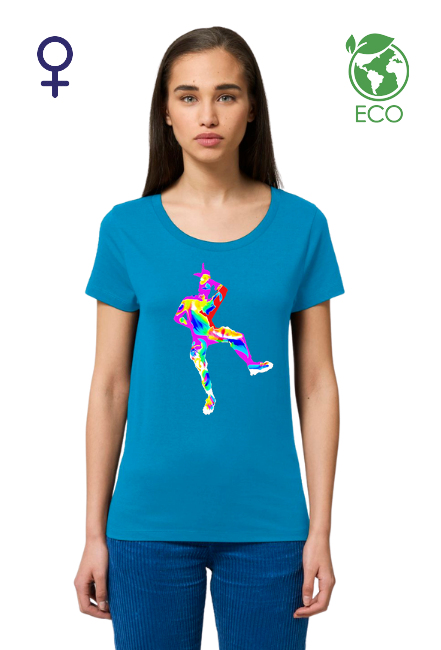 Damska koszulka z linii Eco Aware. Posiada wszywane rękawy, ściągacz na kołnierzyku oraz taśmę wzmacniającą na karku. Rękawy i dół z wąskim podwójnym ściegiem. Materiał: single jersey: 100% organiczna bawełna czesana ring spun. Gramatura 150 g/m². Posiada certyfikaty: GOTS (Global Organic Textile Standard), GRS, OCS, OEKO-TEX Standard 100, Fair Wear.