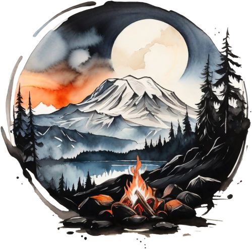 Ten zachwycający obraz przedstawia góry na tle księżyca, las i ognisko podróżnika. Idealny dla miłośników przyrody, podróży i odpoczynku pod gołym niebem. Przenieś ducha przygody do swojej przestrzeni w górach pod gwiazdach.
