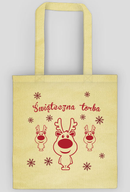 Torba z napisem "świąteczna torba", z nadrukowanymi reniferami i płatkami śniegu.