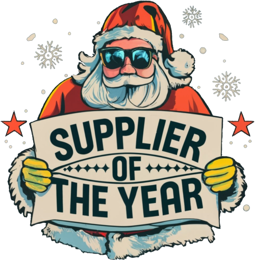 Szczęśliwy Święty Mikołaj w okularach przeciwsłonecznych trzyma tabliczkę z napisem „Supplier of the Year”, podczas gdy płatki śniegu delikatnie opadają. Ten unikalny projekt przypadnie do gustu kierowcom ciężarówek, dostawcom i osobom pracującym w branżach związanych z transportem, logistyką i łańcuchami dostaw. To idealny wzór dla osób pragnących wyróżnić się w branży oraz świętny pomysł na prezent święteczny dla pracowników z powyższych branży.