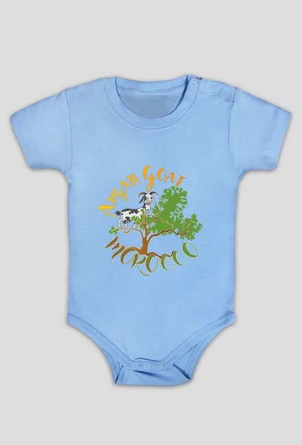 Argan Goat Morocco. Body niemowlęce z oryginalną grafiką przedstawiającą typowy marokański widok – koza na drzewie arganowca jedząca jego owoce.