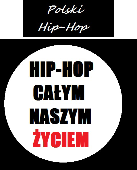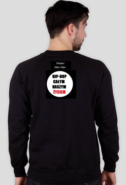 Bluza "HIP-HOP CAŁYM NASZYM ŻYCIEM" czarna. Z tyłu biały mały napis "Polski Hip-Hop" i okrągłe logo (widoczne na zdjęciu).