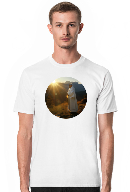 Ta wyjątkowa koszulka łączy w sobie cyfrowo wygenerowany wizerunek Jana Pawła II z górami - miejscem, które było szczególnie bliskie sercu tego wielkiego człowieka i papieża. Na jasnym tle widnieje wizerunek Karola Wojtyły, który został ukazany w białych szatach.