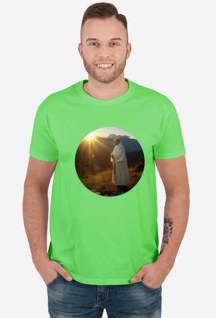 Ta wyjątkowa koszulka łączy w sobie cyfrowo wygenerowany wizerunek Jana Pawła II z górami - miejscem, które było szczególnie bliskie sercu tego wielkiego człowieka i papieża. Na jasnym tle widnieje wizerunek Karola Wojtyły, który został ukazany w białych szatach.