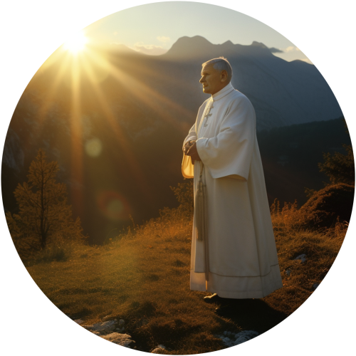 Za Jego plecami widać masyw górski, co nawiązuje do miłości Jana Pawła II do gór i pasji wspinaczkowej.