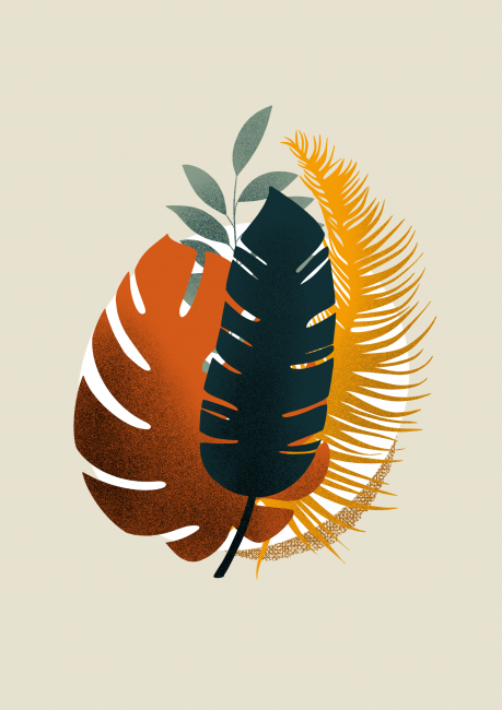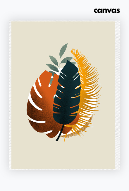 Obraz w stylu japońskim i skandynawskim. Niesamowity kolorowy obraz na płótnie Kompozycja z tropikalnych liści. Obraz ociepla wybrane wnętrze głęboka trójwymiarowość. Obraz na płótnie z ciepłymi kolorami.