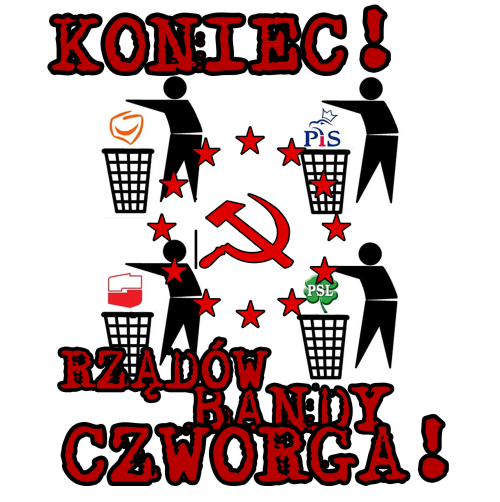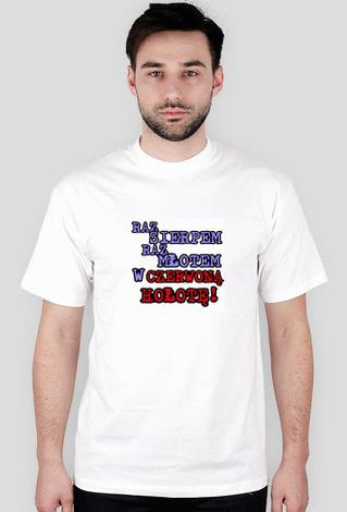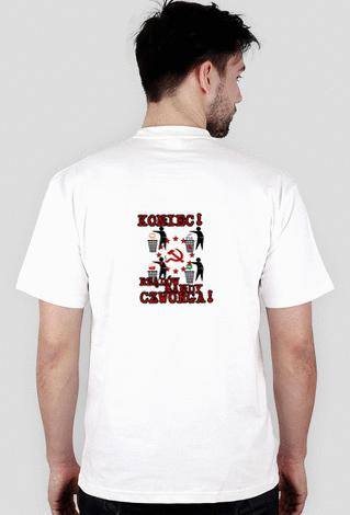Koszulka biała, z przodu hasło "raz sierpem, raz młotem w czerwoną hołotę", z tyłu hasło "koniec rządów bandy czworga"