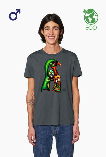 Męska koszulka z linii Eco Aware. Posiada wszywane rękawy, ściągacz na kołnierzyku oraz taśmę wzmacniającą na karku. Rękawy i dół z wąskim podwójnym ściegiem. Materiał: single jersey: 100% organiczna bawełna czesana ring spun. Gramatura 150 g/m². Posiada certyfikaty: GOTS (Global Organic Textile Standard), GRS, OCS, OEKO-TEX Standard 100, Fair Wear.
