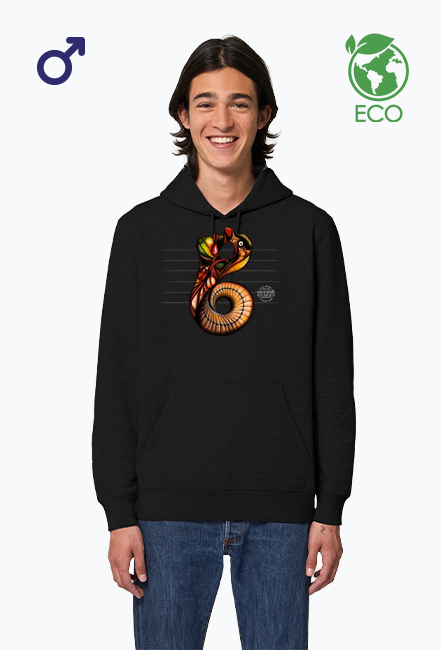 Bluza z kapturem męska z linii Eco Awar. Posiada kaptur z podszewką z pojedynczego dżerseju, kieszeń kangurkę, wszywane rękawy oraz ściągacze przy rękawach i u dołu. Skład materiałowy: 85% organiczna bawełna czesana ring spun, 15% poliester pochodzący z recyklingu. Gramatura 280 g/m². Posiada certyfikaty: GOTS (Global Organic Textile Standard), GRS, OCS, OEKO-TEX Standard 100, Fair Wear.