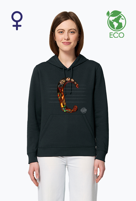 Bluza z kapturem damska z linii Eco Awar. Posiada kaptur z podszewką z pojedynczego dżerseju, kieszeń kangurkę, wszywane rękawy oraz ściągacze przy rękawach i u dołu. Skład materiałowy: 85% organiczna bawełna czesana ring spun, 15% poliester pochodzący z recyklingu. Gramatura 280 g/m². Posiada certyfikaty: GOTS (Global Organic Textile Standard), GRS, OCS, OEKO-TEX Standard 100, Fair Wear.