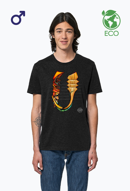 Męska koszulka z linii Eco Aware. Posiada wszywane rękawy, ściągacz na kołnierzyku oraz taśmę wzmacniającą na karku. Rękawy i dół z wąskim podwójnym ściegiem. Materiał: single jersey: 100% organiczna bawełna czesana ring spun. Gramatura 150 g/m². Posiada certyfikaty: GOTS (Global Organic Textile Standard), GRS, OCS, OEKO-TEX Standard 100, Fair Wear.