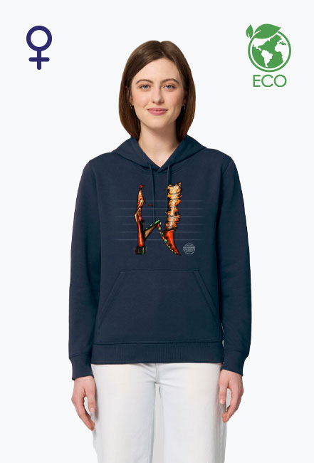 Bluza z kapturem damska z linii Eco Awar. Posiada kaptur z podszewką z pojedynczego dżerseju, kieszeń kangurkę, wszywane rękawy oraz ściągacze przy rękawach i u dołu. Skład materiałowy: 85% organiczna bawełna czesana ring spun, 15% poliester pochodzący z recyklingu. Gramatura 280 g/m². Posiada certyfikaty: GOTS (Global Organic Textile Standard), GRS, OCS, OEKO-TEX Standard 100, Fair Wear.