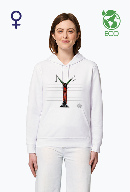 Bluza z kapturem damska z linii Eco Awar. Posiada kaptur z podszewką z pojedynczego dżerseju, kieszeń kangurkę, wszywane rękawy oraz ściągacze przy rękawach i u dołu. Skład materiałowy: 85% organiczna bawełna czesana ring spun, 15% poliester pochodzący z recyklingu. Gramatura 280 g/m². Posiada certyfikaty: GOTS (Global Organic Textile Standard), GRS, OCS, OEKO-TEX Standard 100, Fair Wear.