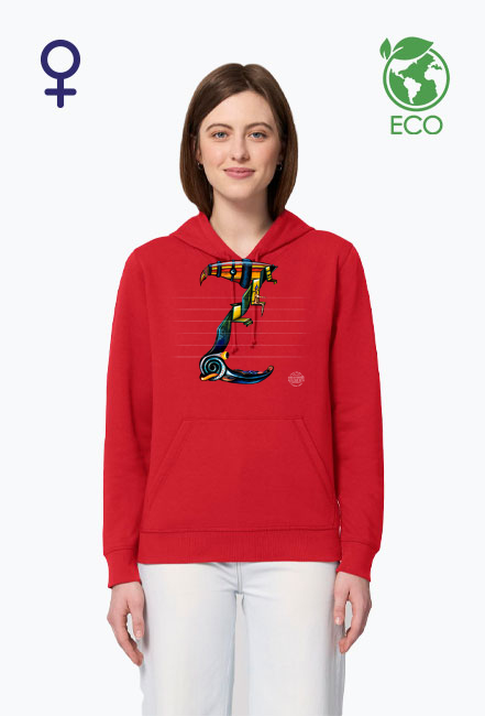 Bluza z kapturem damska z linii Eco Awar. Posiada kaptur z podszewką z pojedynczego dżerseju, kieszeń kangurkę, wszywane rękawy oraz ściągacze przy rękawach i u dołu. Skład materiałowy: 85% organiczna bawełna czesana ring spun, 15% poliester pochodzący z recyklingu. Gramatura 280 g/m². Posiada certyfikaty: GOTS (Global Organic Textile Standard), GRS, OCS, OEKO-TEX Standard 100, Fair Wear.