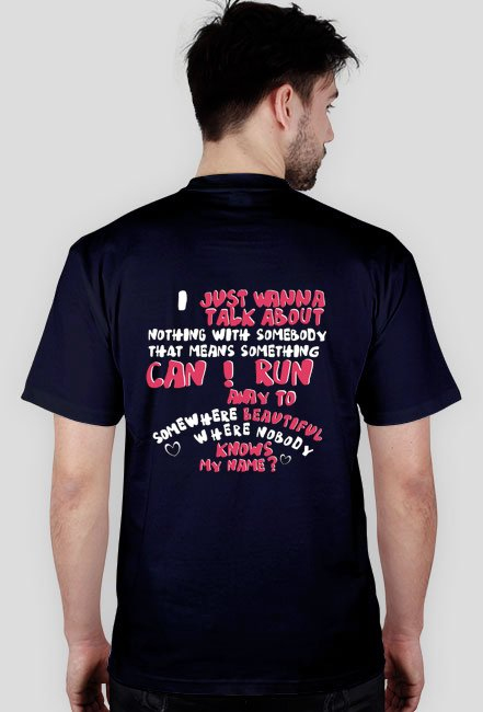 Model ma na sobie koszulkę w rozmiarze M. Maksymalne wymiary nadruku to 30cm (szerokość)