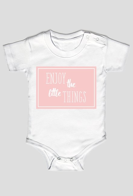 Bawełniane dziecięce body z pozytywnie nastawiającą nas sentencją "ENJOY THE LITTLE THINGS" w otoczeniu pudrowego różu w sam raz dla dziewczynki.