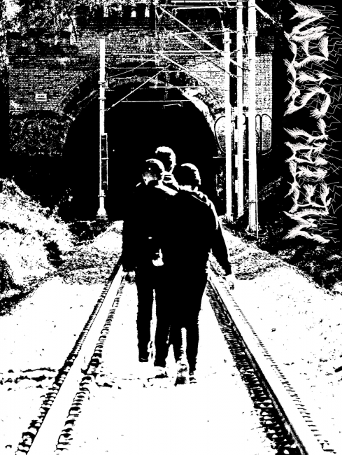 Koszulka Metal Stein Production - Tunel przedstawia ludzi, idących w stronę ciemnego tunelu. Po prawej stronie u góry, widnieje logo marki. Koszulka w kolorze białym, nadruk czarno - biały.