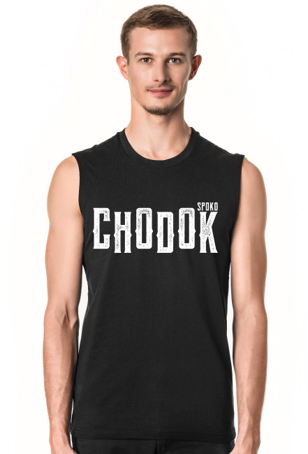 Czarna męska koszulka bez rękawów z nadrukiem - Spoko Chodok. Dla chłopaka, chłopaków, mężczyzny, mężczyzn z humorem. W gwarze z terenu Małopolski (a może gdzie indziej też) Chodok oznacza chłopaka. Moda i trendy, śmieszne t-shirty, humor, mężczyźni. T-shirt bezrękawnik.