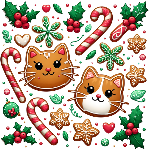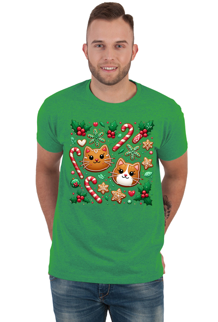 Wprowadź świąteczny klimat do swojej garderoby! Koszulka z grafiką uroczych piernikowych kotków, otoczonych gałązkami ostrokrzewu, laskami cukrowymi i płatkami śniegu, to idealny wybór dla miłośników kotów i świątecznej magii.