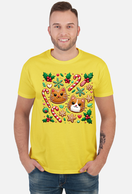 Wprowadź świąteczny klimat do swojej garderoby! Koszulka z grafiką uroczych piernikowych kotków, otoczonych gałązkami ostrokrzewu, laskami cukrowymi i płatkami śniegu, to idealny wybór dla miłośników kotów i świątecznej magii.
