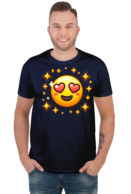 Wprowadź do swojej szafy koszulkę pełną pozytywnej energii! Grafika przedstawia żółtego emoji z oczami w kształcie serc, otoczonego delikatnymi, połyskującymi gwiazdkami, które dodają całości magii i uroku. Ten projekt emanuje radością, miłością i lekkim, figlarnym charakterem. Koszulka idealna na co dzień, spotkania z przyjaciółmi czy jako wyjątkowy prezent dla osoby, która wnosi radość do Twojego życia.