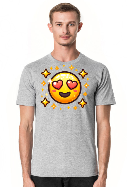 Wprowadź do swojej szafy koszulkę pełną pozytywnej energii! Grafika przedstawia żółtego emoji z oczami w kształcie serc, otoczonego delikatnymi, połyskującymi gwiazdkami, które dodają całości magii i uroku. Ten projekt emanuje radością, miłością i lekkim, figlarnym charakterem. Koszulka idealna na co dzień, spotkania z przyjaciółmi czy jako wyjątkowy prezent dla osoby, która wnosi radość do Twojego życia.