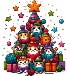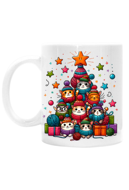 Rozkoszuj się ulubionymi napojami w kubku, który wnosi świąteczną atmosferę do każdego poranka. Urocze kotki, układające się w kształt choinki, to idealny akcent na zimowe dni. Dodatek prezentów z włóczki sprawia, że ten kubek jest świetnym pomysłem na prezent.