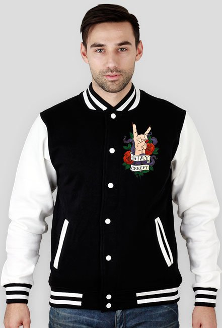 Bluza varsity jacket inspirowana amerykańskim stylem studenckim to opcja dla każdego, kto ceni sobie połączenie funkcjonalności z oryginalnym designem. Materiał, z którego została wykonana to wysokiej jakości bawełna, która ma przewiewną strukturę i daje uczucie miękkości i wygody. Posiada kontrastowe paski na ściągaczach u dołu bluzy i rękawów. Bluza jest zapinana na zatrzaski w kontrastowym kolorze.