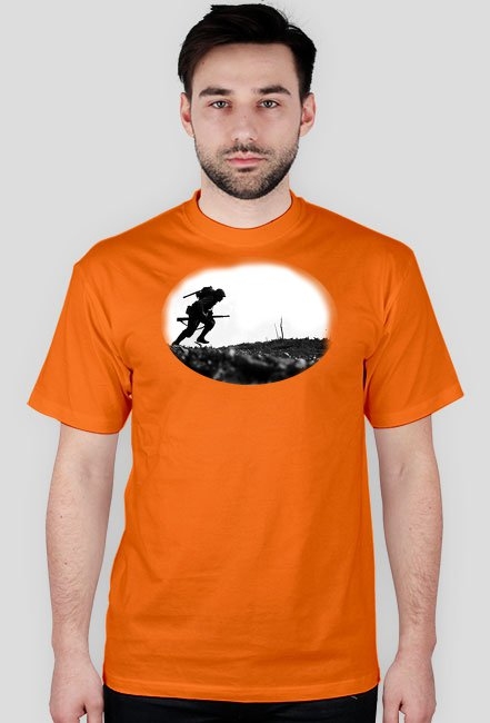 Model ma na sobie koszulkę w rozmiarze M. Maksymalne wymiary nadruku to 30cm (szerokość)
